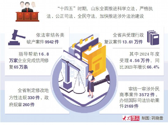 记者10月9日从省政府新闻办举行的新闻发布会上获悉,“十四五”时期,山东全面推进科学立法、严格执法、公正司法、全民守法,加快推进涉外法治建设,为新时代社会主义现代化强省建设提供了有力法治保障。山东连续四年入选营商环境最好10个省份,其中法治环境位居全国前列。